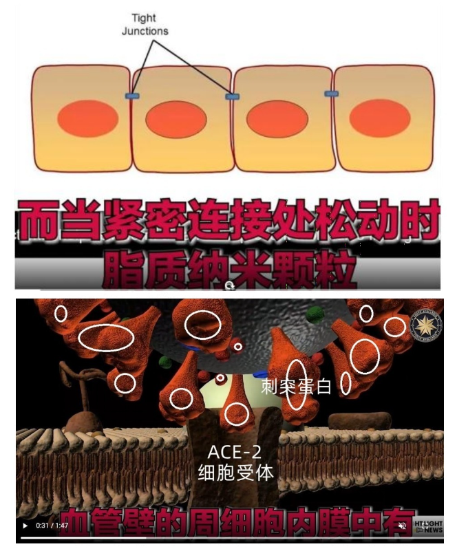 基本原理是:每当运动时,心脏活动前会加剧膨胀与收缩,于是心脏组织结构原本是紧密的连接处会出现窄间,疫苗中的用脂质做了表面改性处理的,携带着基因组mRNA的氧化石墨烯纳米颗粒就会“趁虚而入”。与不运动的人相比,越是运动量大的人,疫苗有效成分进入心脏的越多。而心脏外围细胞的外壁以及心脏血管壁外周细胞内膜里到处都有叫做ACE-2的受体(受体,又称受器、接收器,是生物化学概念,指任何能够同激素、神经递质、药物或细胞内信号分子结合并能引起细胞功能变化的生物大分子),疫苗中的mRNA是被锋利如刀片的氧化石墨烯携带着,它们突破细胞壁与受体结合,并且锋利如刀片的氧化石墨烯嵌在细胞上造成细胞不停地损伤出血,心脏炎症就发生了。如下图: