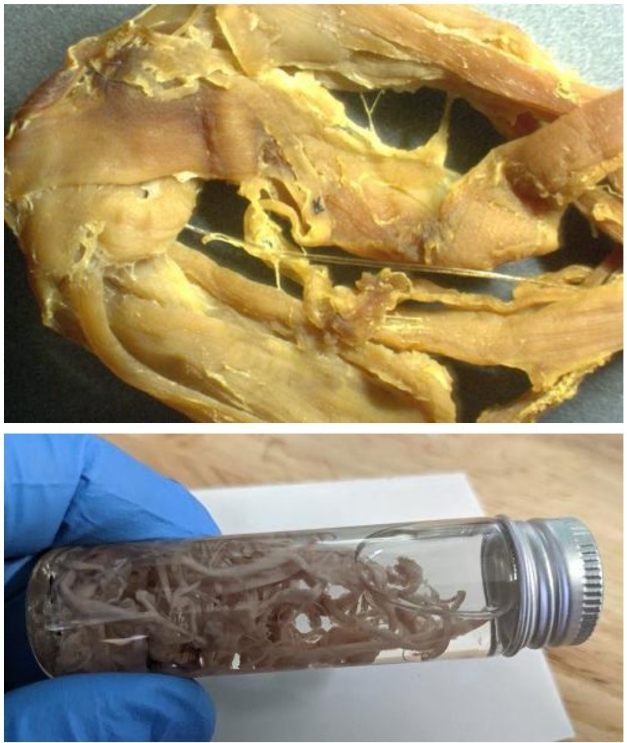 上图是《尸检发现接种疫苗的人体内有大量血凝块生物结构》文章里的实物照片,稍有常识的人都知道这根本就不是血液的凝集物,而是“蛋白样物质”呈透明的凝胶或果冻状,坚韧的纤维状并且具弹性。这些“蛋白样带状物质”位于血管和动脉中,一旦堵塞血管立刻造成器官或组织坏死,甚至直接导致死亡。上图片的“血栓”干燥后的样本是这样的: