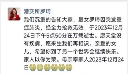 12月24日大陆知名财经媒体人、新浪财经国际部亚太区前首席代表(港交所)罗琦感染肺炎引发高烧去世,年仅36岁。