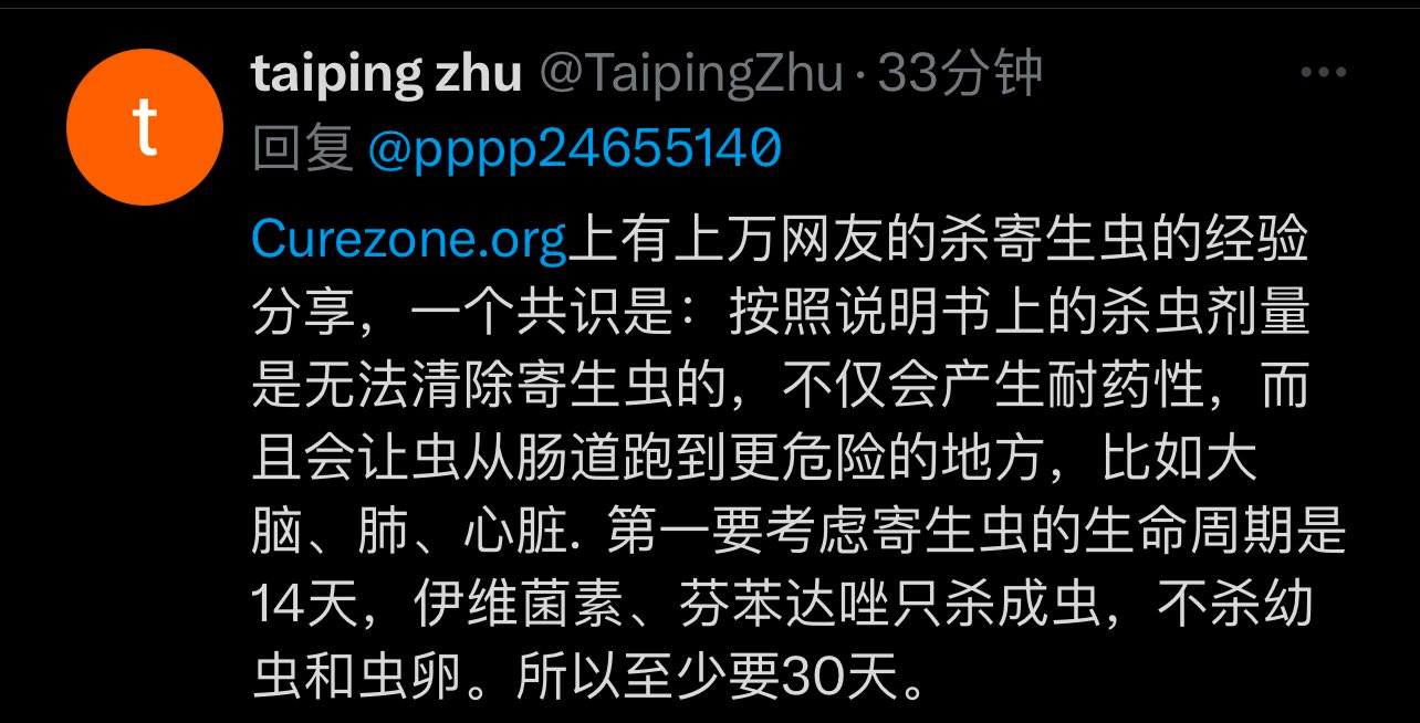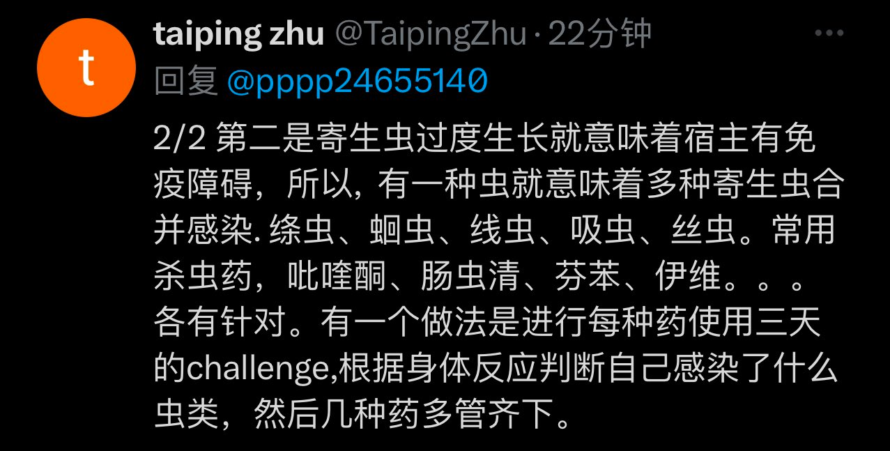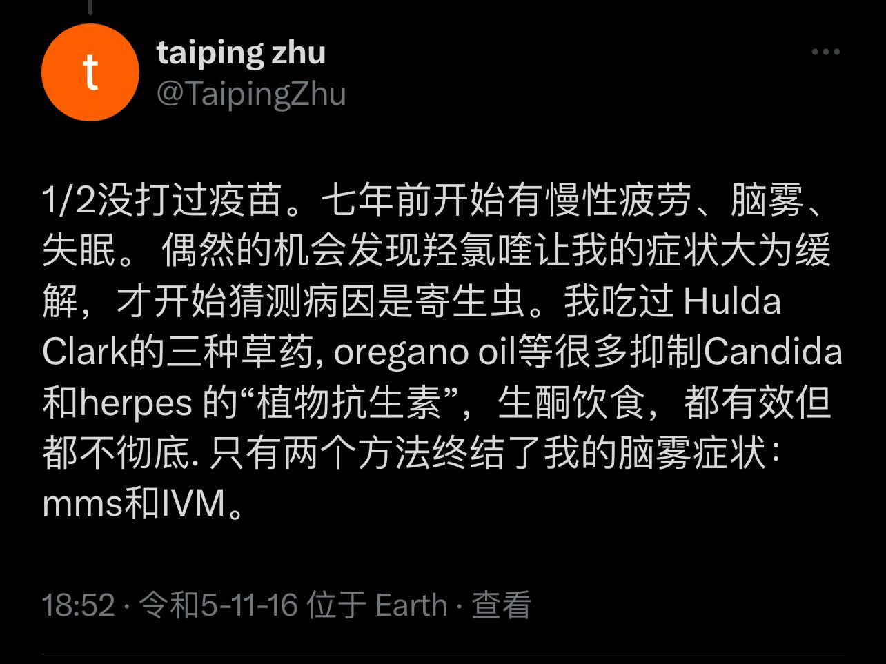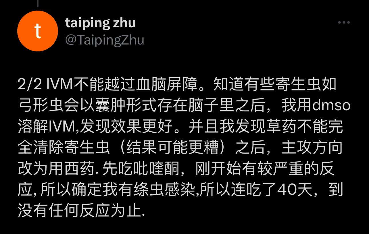 重要!!!看一下这位推友的经验: 如果体内有很多寄生虫,按说明书来,只吃四颗伊维菌素是不够的,需要多疗程 该推友的症状是脑雾、慢性疲劳、失眠通过多疗程多管齐下的杀虫治疗,大为改善看来吃多少还是得因人而异,不过进一步证明了处理寄生虫问题的必要性.