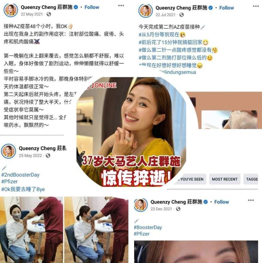 2023年11月28日,马来西亚著名女歌手庄群施拍戏时猝死,年仅37岁,突然呼吸困难到死亡仅30多分钟。她打了四针新冠疫苗。