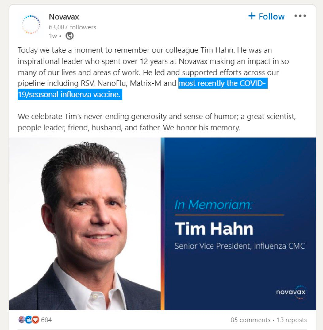 Novavax高级副总裁Tim Hahn于2023年12月18日突然去世,他领导了各种疫苗的工作,包括COVID-19 Novavax疫苗,他这是被“猝死”了还是打了真的疫苗,参与这个疫苗计划的工具人们,这就是你们的前车之鉴了。